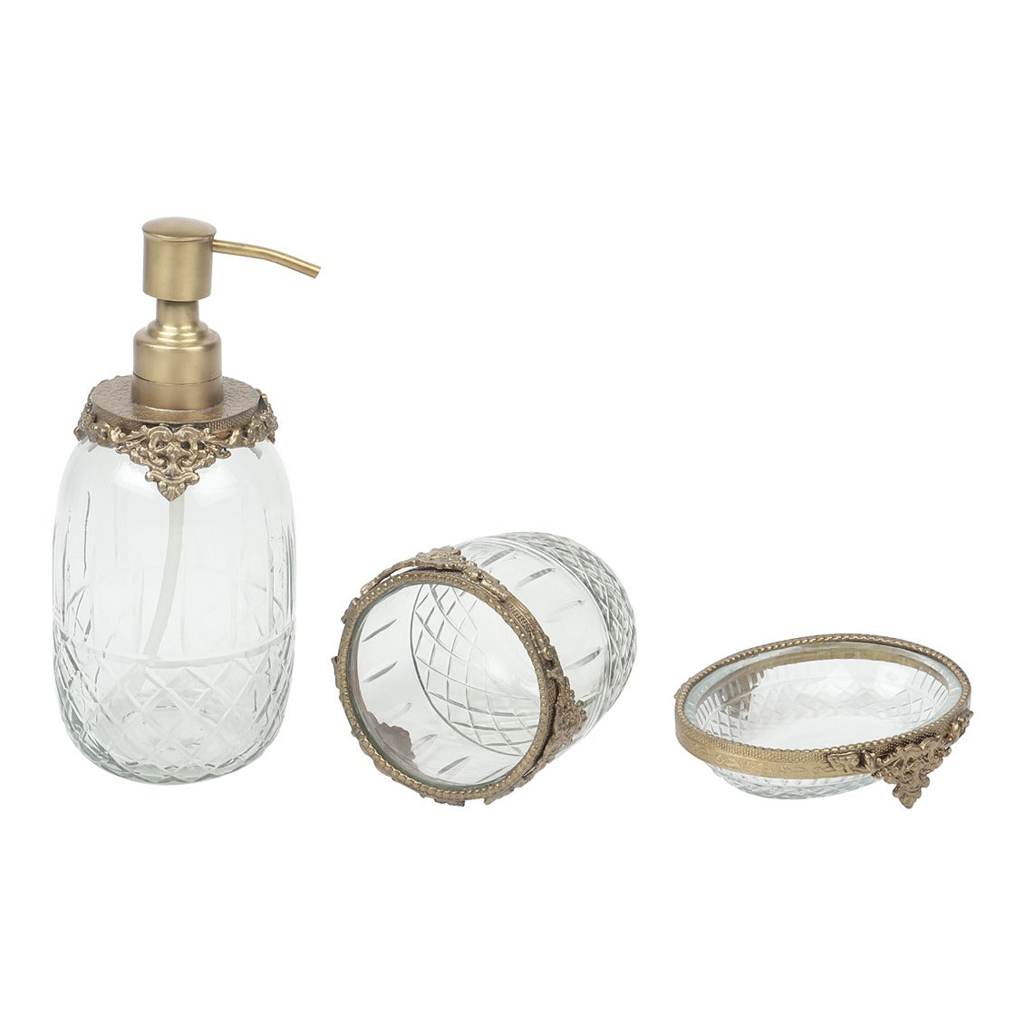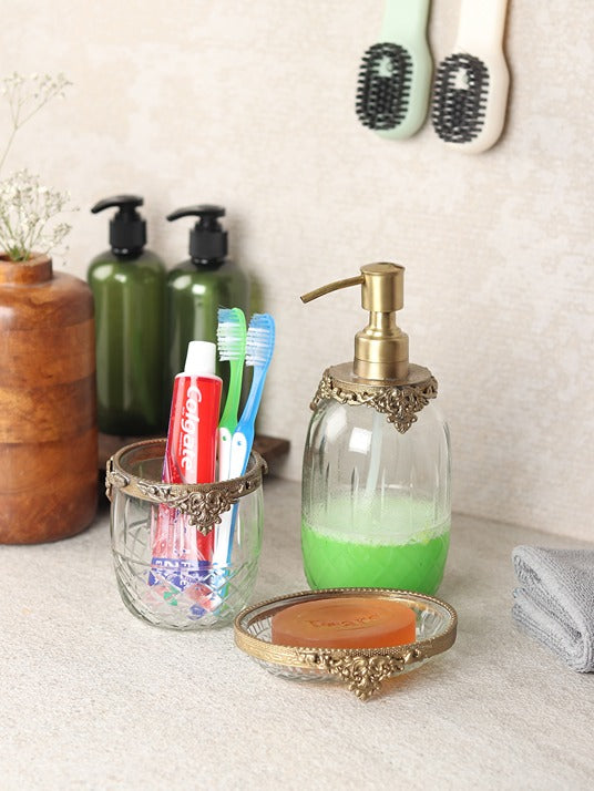 The Regal Brass Accents Bathroom Set Exudes Opulence And Grandeur With Its Exquisite Glass Pieces Adorned With Intricate Cut Patterns. This Luxurious Set Includes A Soap Dish, A Dispenser, And A Stand, Each Adorned With Antique Brass Rings That Add A Touch Of Vintage Charm. Elevate Your Bathroom Decor With This Regal Ensemble, And Indulge In The Elegance Of Its Intricate Craftsmanship And Timeless Allure.