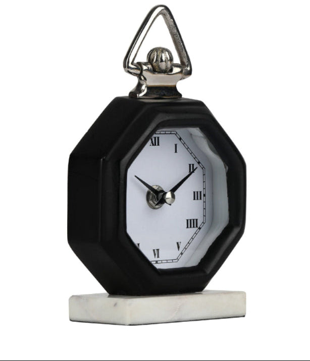 Decorative clock with Roman numerals on a surface with books and pinecones. Black pocket watch on a marble base with a white background Black  Victoria Table Clock Black  Victoria Table Clock