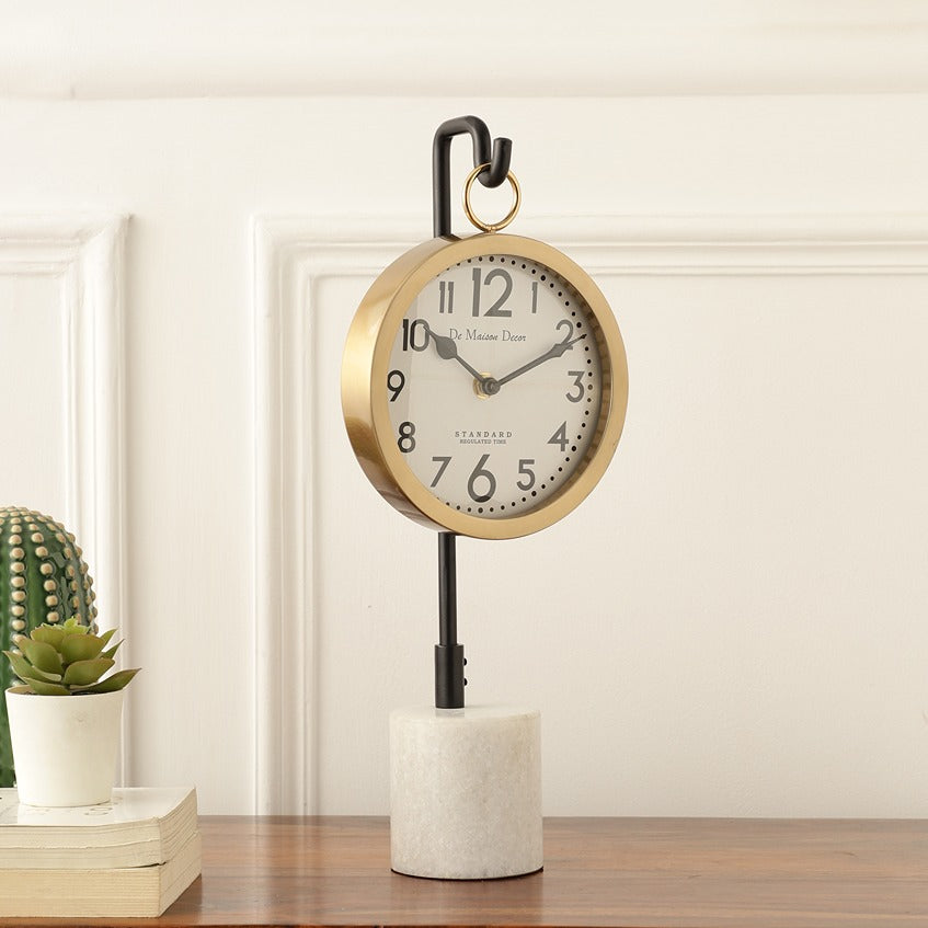 This Unique Table Clock Is A True Work Of Art, Featuring A Luxurious Marble Base And A Hanging Stand With A Hook To Suspend The Clock. The Sleek Design And Clean Lines Make This Clock A Perfect Addition To Any Modern Or Traditional Decor. The High-Quality Materials Ensure That This Clock Will Be A Treasured Piece In Your Collection For Years To Come. Whether Placed On A Desk Or Tabletop, This Clock Will Surely Make A Stylish Statement.