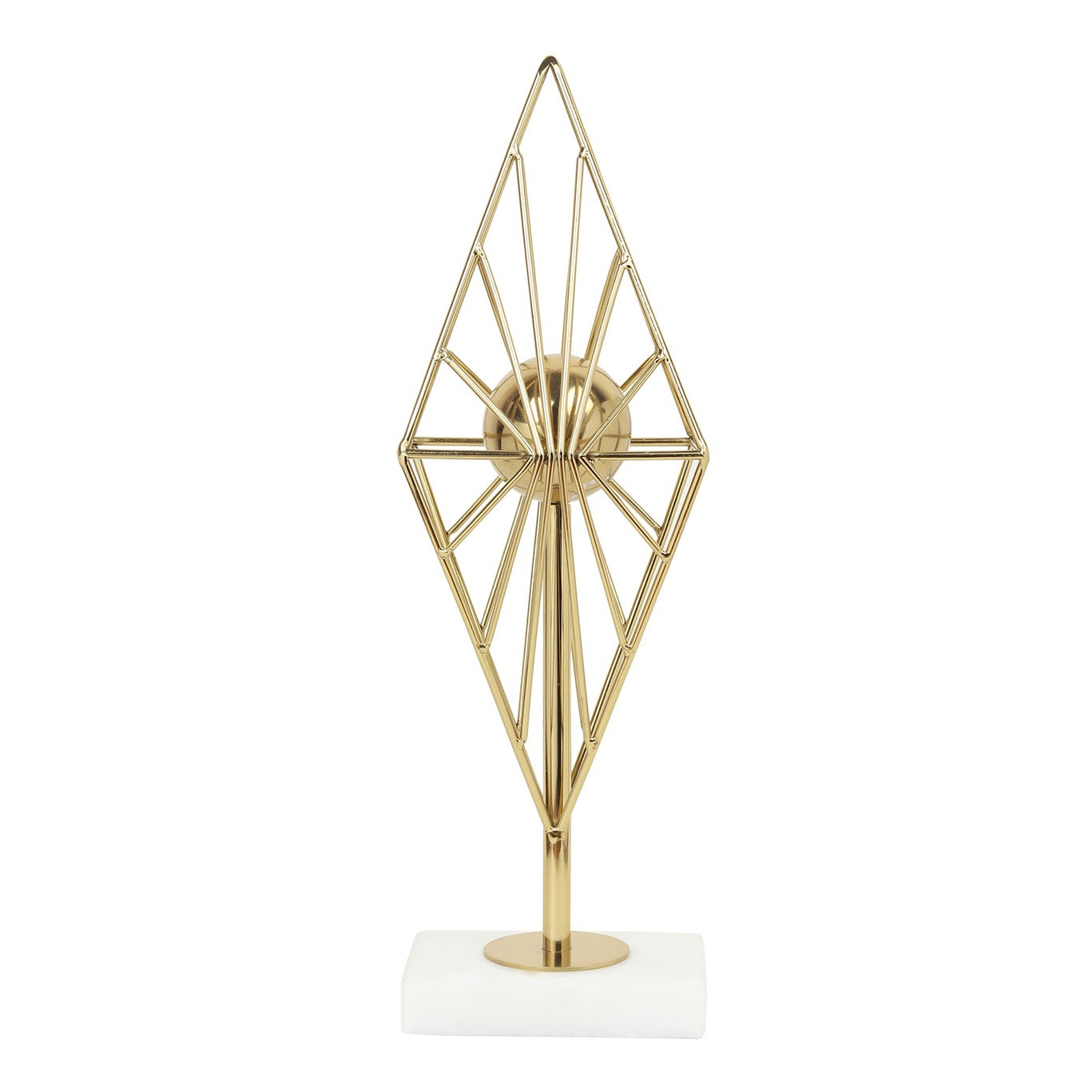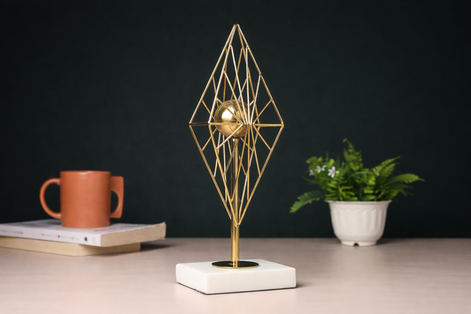 The Diamond Prism Decor in Gold is a striking tabletop sculpture characterized by its intricate geometric design. This piece features a series of interconnected metallic rods forming a diamond shape, with a polished central sphere, all poised on a solid, white marble base. The gold finish enhances its modern aesthetic, adding a touch of luxury and elegance. The sculpture's uniqueness lies in its complex structure and reflective surfaces, which catch and play with light beautifully, making it an engaging focal point. it can be placed on office desks, living room shelves, or as a standout piece in entryways or reception areas, infusing spaces with a sophisticated, contemporary charm.