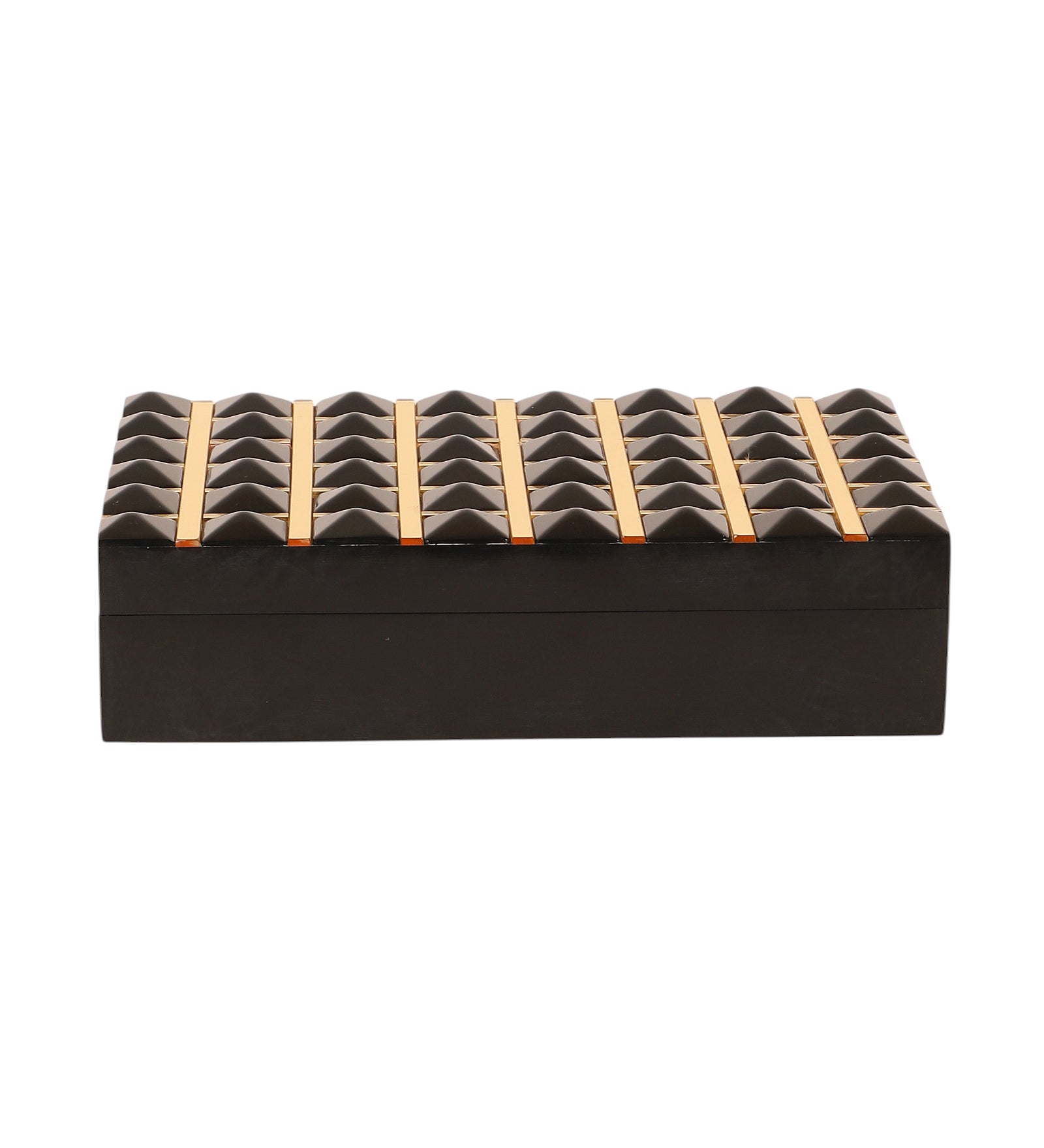 A striking black box crowned with a precise gold grid pattern. Modern yet timeless, this piece brings a sense of refined geometry and understated luxury to any room.