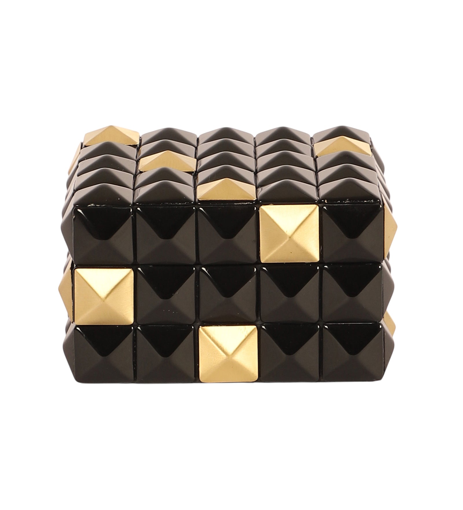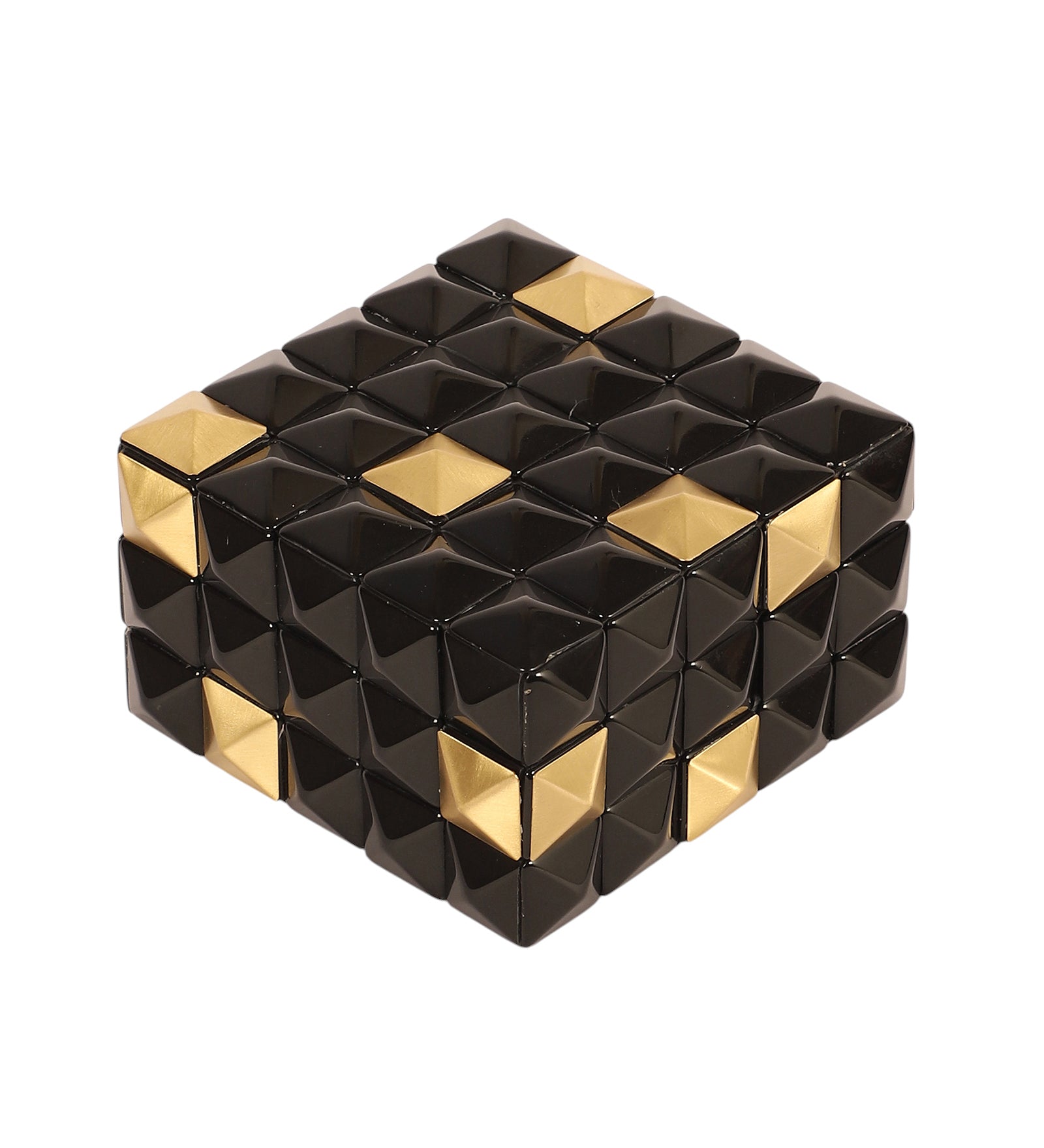 A striking black and gold studded box that exudes modern glamour. Its bold geometric pattern makes it a standout accent piece for sophisticated interiors.