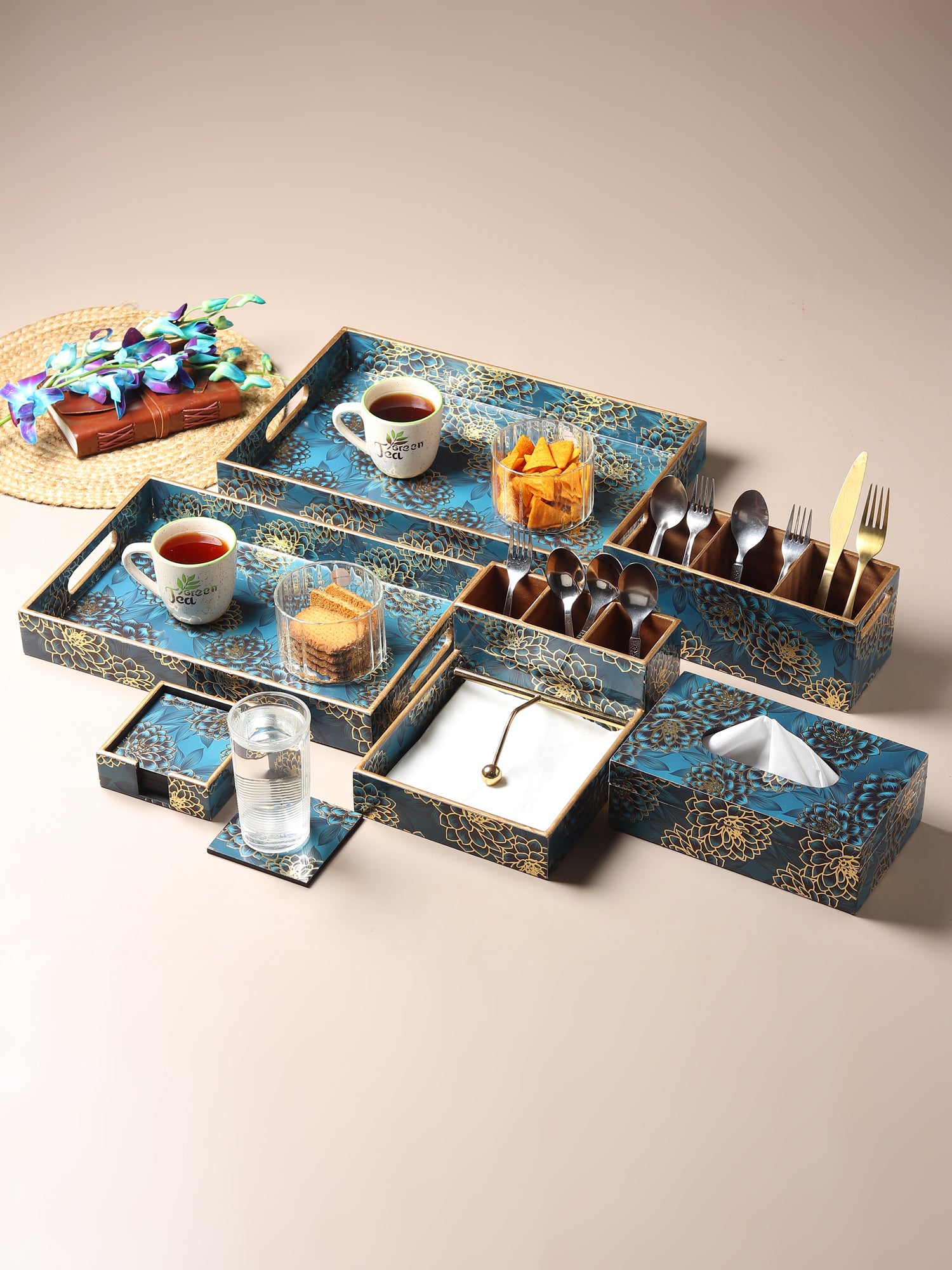 Sapphire Wreath blooms with soft floral patterns drifting across a deep sapphire surface, gently traced with golden touches that catch the light like quiet sparks. The design feels calm yet expressive, where layered petals create a sense of flow and harmony. Finished with a clear enamel coating, it offers a luxurious, high-gloss shine while enhancing durability and protection. Made to hold cutlery with ease, it feels both peaceful and special—bringing gentle beauty to everyday kitchen and dining moments.