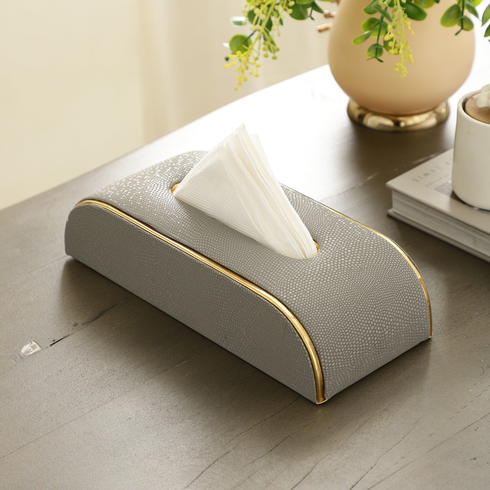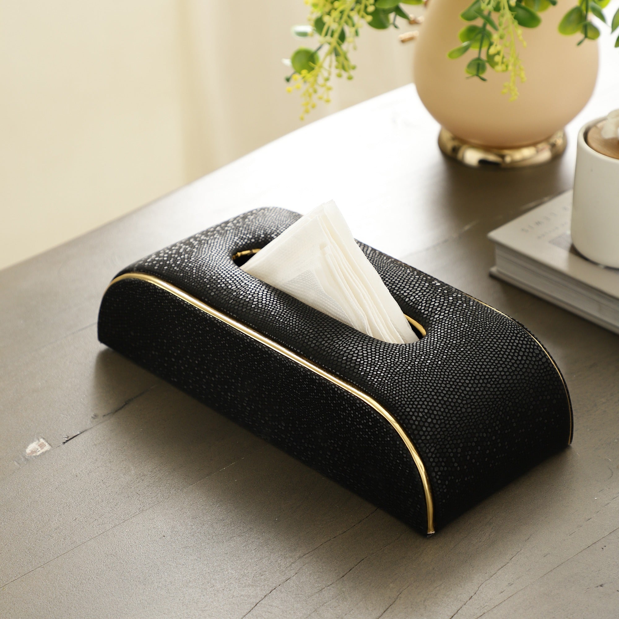 Elevate your table decor with the Regal Slant Napkin Box. This exquisite piece, featuring a sleek and modern design with elegant gold trim, adds a touch of sophistication to any setting. Its slanted shape not only offers a unique aesthetic but also provides easy access to your napkins. Perfect for both home and office use, this napkin box is a must-have accessory for those who appreciate the finer things in life.